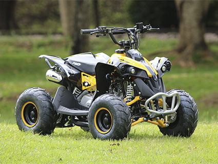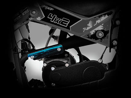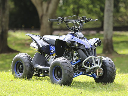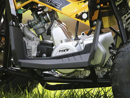 O quadriciclo MXF THOR 49 é fabricado em aço tubular, o que lhe proporciona grande resistência, freios a disco e estacionários, transmissão automática e botão de segurança para limitar a velocidade. Segurança garantida para a diversão das crianças. MXF THOR 49 foi pensado para crianças de 4 a 8 ano com altura de até 1,40m. Motor 2 tempos com refrigeração a ar. Possui uma velocidade máxima de 40km/h, sua potência chega até 3,5cv com 7500rmp. A versatilidade vem com seu peso de apenas 40kg e a possibilidade de carga de os mesmos 40Kg. Como a atualização dos nossos produtos é constante, as especificações técnicas devem ser consultadas